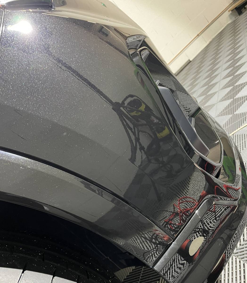En inspectant son véhicule, malgré qu'il soit neuf, il s'est avéré qu'un mauvais lavage a endommagé le vernis. Nous avons donc procéder un lustrage complet de la carrosserie avant d'appliquer le traitement céramique.