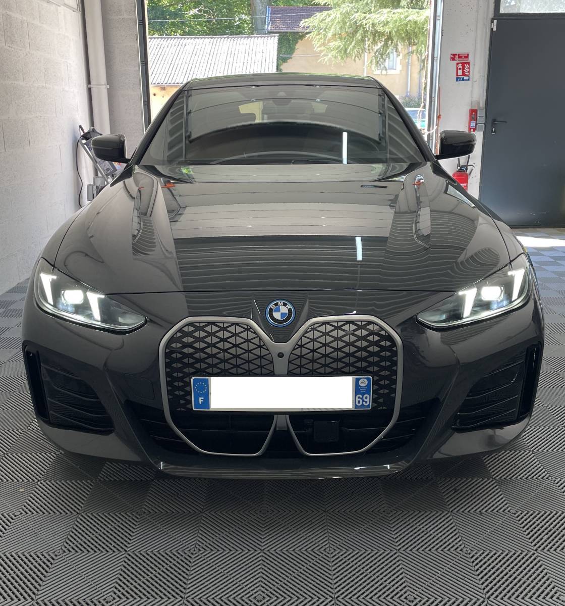 BMW i4 Individual en cours de traitement céramique à Fleurieu-sur-Saône, dans notre atelier AM Covering & Detailing, proche de Lyon.