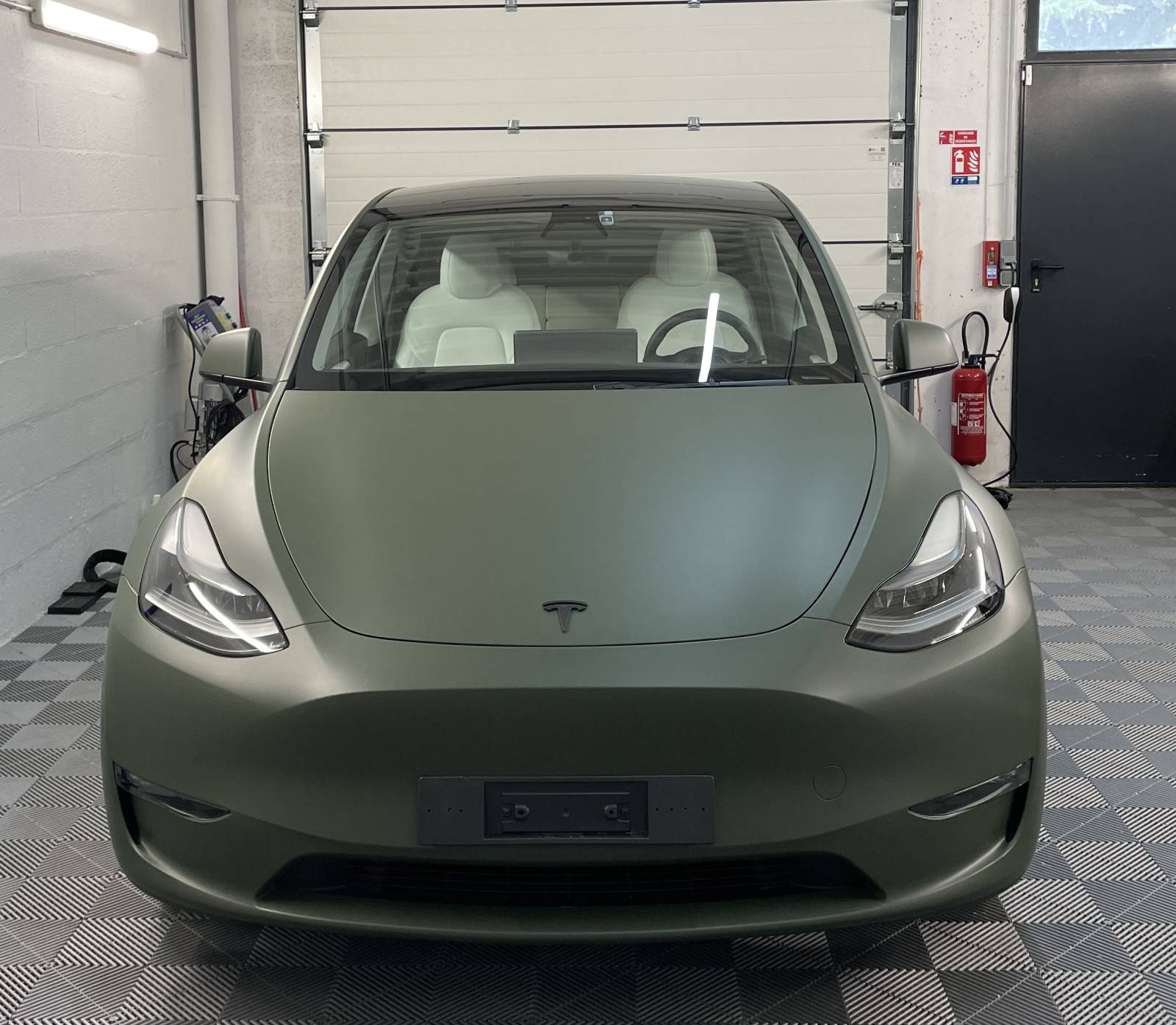 Covering complet sur une Tesla Model Y vert mat olive à Lyon